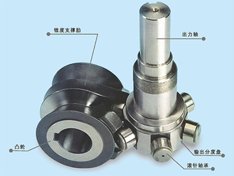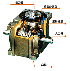 分制器結(jié)構(gòu)的設(shè)計是,安裝在入力軸上的凸輪,與固定在出 力軸的分度盤上的滾針軸承嚙合,以徑向鉗入在分度盤圓周表面 的滾針軸承,與凸輪相應(yīng)的斜面作線性接觸。 當(dāng)入力軸旋轉(zhuǎn)時,凸輪按照給定的位移曲線轉(zhuǎn)動,分度盤兩 組滾針軸承,騎在凸輪的直線上時,即在靜態(tài)范內(nèi),滾針軸承轉(zhuǎn) 動,但分度盤本身并不旋轉(zhuǎn)。 凸輪旋轉(zhuǎn)到曲線位置時,通常由兩個凸輪滾子接觸轉(zhuǎn)換為三 個凸輪滾子接觸,以便出力軸的旋轉(zhuǎn)可均勻?qū)⒘鬟f到出力軸。 如果在凸輪表面和滾針軸承之間有不滑順情況,則會損害分 割器。通過旋轉(zhuǎn)支撐入力軸的偏心套,以調(diào)整入力軸和出力軸之 間的距離,可排除旋轉(zhuǎn)不滑順的現(xiàn)象。通過調(diào)整預(yù)負(fù)荷,來接近 滾針軸承和凸輪的彈性區(qū),從而加強分割器的剛性。