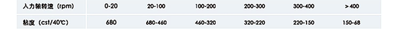 當(dāng)入力軸轉(zhuǎn)速之相應(yīng)粘度在兩種粘度范圍之間,請使用較高粘度的油品。